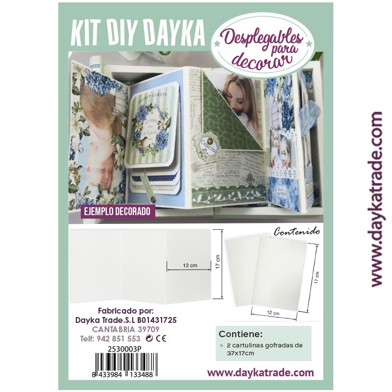 Contiene dos desplegables cartulina blanca de 350 gr dobladas doblada en 3 partes .Medida total 37×17 cm cada una (que se pueden unir).Plegadas miden 12×17 cm. Para que puedas decorarlas con papel para scrapbooking y otros elementos decorativos Dayka. Ideal para meter en la caja libro ref: 0431080, 0431077, 04030237, 0403080 y 04030286P.