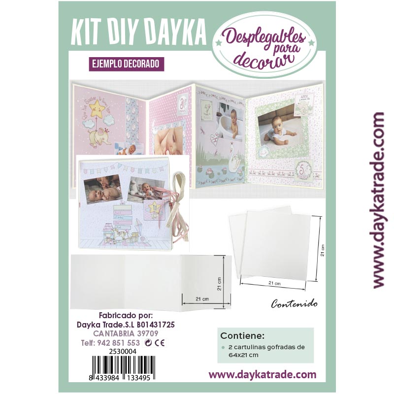 Contiene dos desplegables cartulina blanca de 350 gr dobladas doblada en 3 partes. Medida total 64×21 cm cada una (que se pueden unir). Plegadas miden 21×21 cm. Ideal para utilizar en caja 0431044. Para que puedas decorarlas con papel para scrapbooking y otros elementos decorativos Dayka.