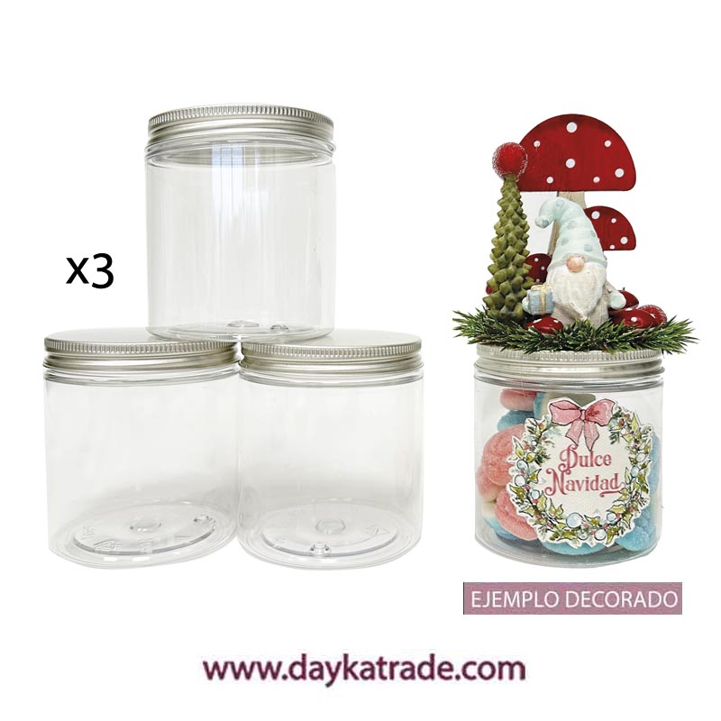 Bote Pet con tapa, para uso alimentario. Capacidad 250 ml, Altura 85 mm y diámetro 71 mm. El precio es por unidad y se vende de 3 en 3 ud. Ideal para guardar, dulces y decorarlo con figuras de resina Dayka, siluetas y otros complementos.