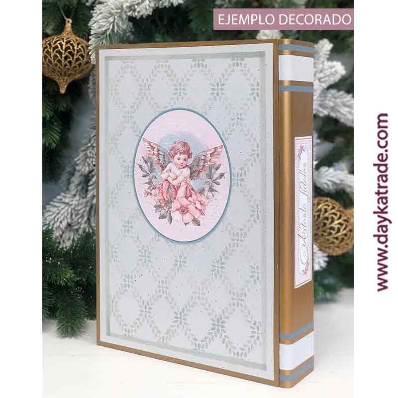 Kit que contiene caja libro (27 x 41 cm), siluetas de madera, letrero Feliz Navidad y tela prediseñada de óvalo con Ángel y lomo “Adeste Fideles”