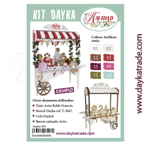 Dayka-555 Es un carrito con dos ruedas, que contiene diferentes siluetas navideñas para decorarlo. Todo de madera.