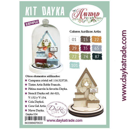 Dayka-534 Contiene la silueta de una casita con unos pájaros y peana de madera, con cartelito en tablero lacado de Feliz Navidad. Se cubre con una campana de cristal por encima. Ref: 115.743536