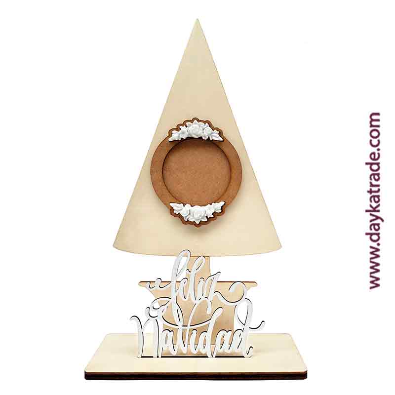 Árbol “Feliz Navidad” con peana. Siluetas, peana de madera, marco de DM, ornamentos de resinas y letrero de Feliz Navidad. Medidas: 28 x 50 cm. Puedes decorar este producto con nuestra gama de pinturas ArtisDayka.