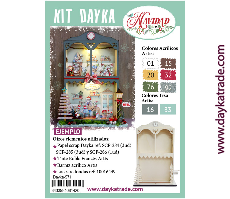 Dayka-571 Contiene estructura del taller de Noel y siluetas como árbol de navidad y farola en madera.