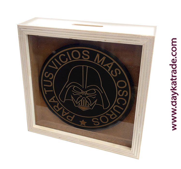 PZR-55 Hucha de madera con cristal y detalle en tablero negro, con mensaje “para tus vicios más oscuros”.