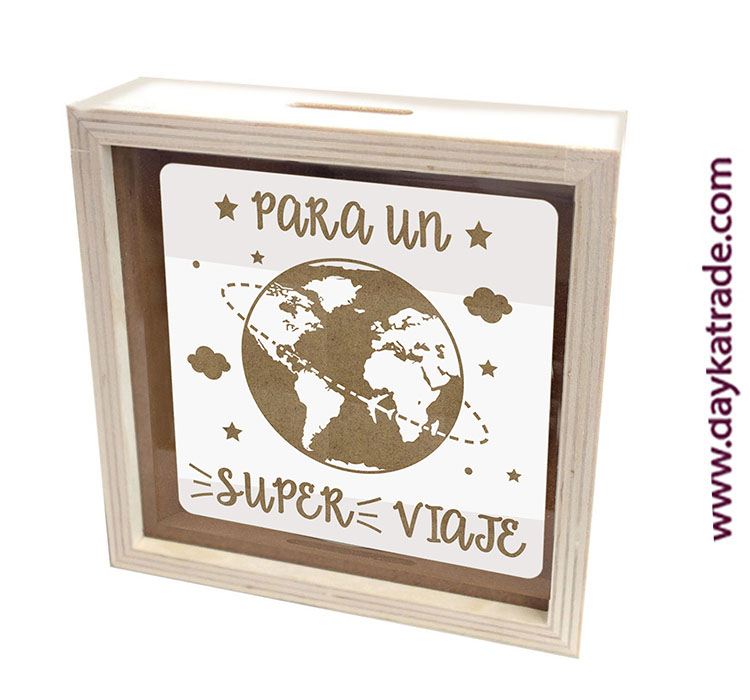 BLC-201 Hucha de madera y cristal. Detalle en tablero lacado con mensaje “para un super viaje”