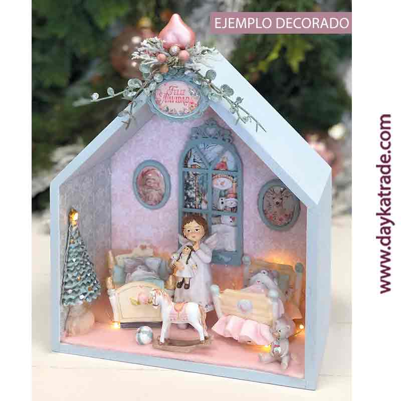 Casita de madera de navidad con figuras de marmolina y resina para decorar. El kit incluye: Casita de madera ref.: 04030260 , osito en cama ref.:1393057, conejito en cama ref.:1393058, árbol con base de resina ref.:RES-024, caballito de resina ref.:RES-023, figura de angelita ref.:22.590069-271, ventana de cartón ref.:CART-158, colgante metálico ref.:0783009, dos medallones ovalados de plata ref.: 0783038. Medidas: 22 x 26 x 11,5 cm. Utilizado en el ejemplo pero no incluidos: papeles de scrap ref.:SCP-667,SCP-664,SCP-663ySCP-669. Ideal para pintar con productos y pinturas ArtisDayka.