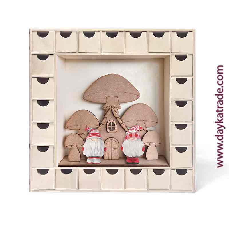 Calendario de adviento gnomos y setas Dayka. Calendario de adviento. El kit incluye: Estructura de calendario con 24 cajones ref.: 0431090, Siluetas en DM de setas, 2 figuras de Gnomos ref.: 49.521246 y papel de scrap con números ref: SCP-669.Medidas: 35,3 x 35,3 x 5,7 cm. Puedes decorar este producto con nuestra gama de pinturas ArtisDayka.