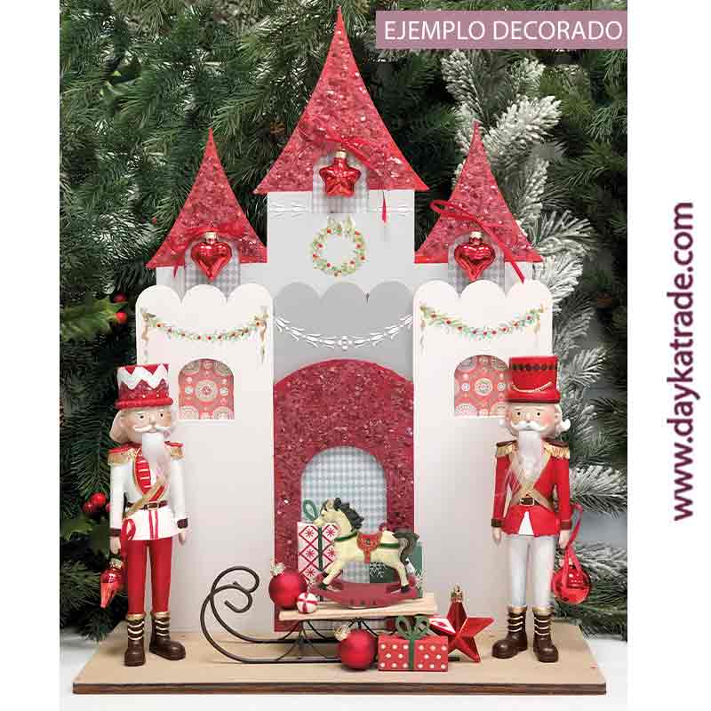 Kit de silueta de castillo con figuras de soldaditos de plomo El kit incluye:Figuras de cascanueces ref.: 22.650513-449, Trineo con regalos ref.: 571749-000-422, Figura de caballito balancín ref.: 10056961, Silueta de castillo de madera con peana. Medidas: 45 x 62 x 20 cm. Ideal para pintar con productos y pinturas ArtisDayka.