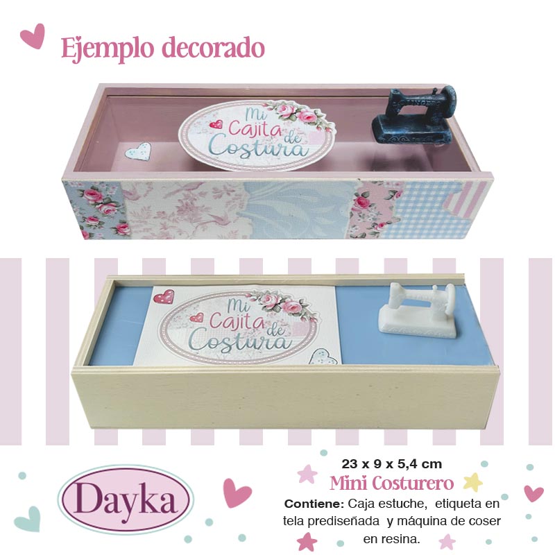 Caja, cierre de metacrilato, cartel en tela prediseñada y máquina de coser en resina.Medidas:23 x 9 x 5,4 para decorar con nuestra gama de pinturas y productos ArtisDayka.
