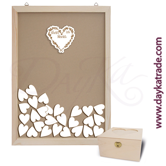 Kit de boda. Incluye marco de cristal con ranura superior + Corazón con mensaje “Vivan los novios” + 50 corazones pequeños + caja de corazón.