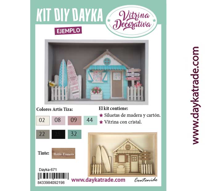 Contiene siluetas de madera, cartón y vitrina con cristal.