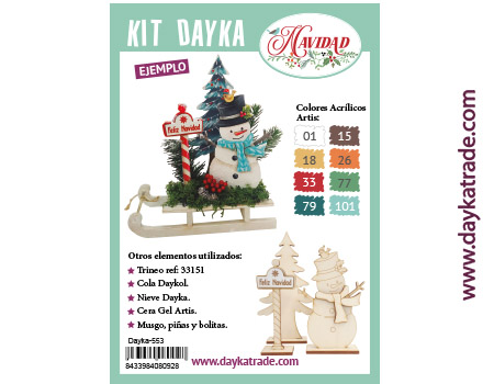 Dayka-553 Contiene las siluetas de un muñeco de nieve, un abeto, y un con cartelito de tablero lacado “Feliz Navidad”, de madera todo.