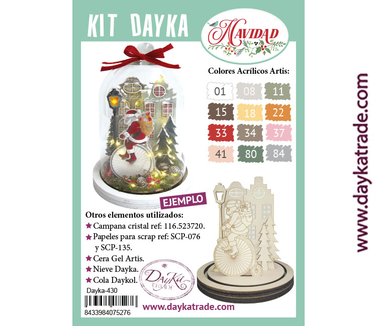 Dayka-430 Contiene un Papá Noel en bici, dos edificios de casitas abetos y una farola, en una peana. Realizado en madera de chopo y tablero lacado, de Dayka Trade.