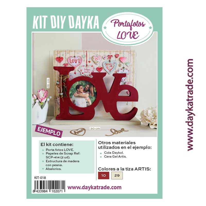 KIT-018 Contiene: Porta fotos LOVE, Papeles de Scrap Ref: SCP-414 (2 ud), estructura de madera con peana y abalorios.