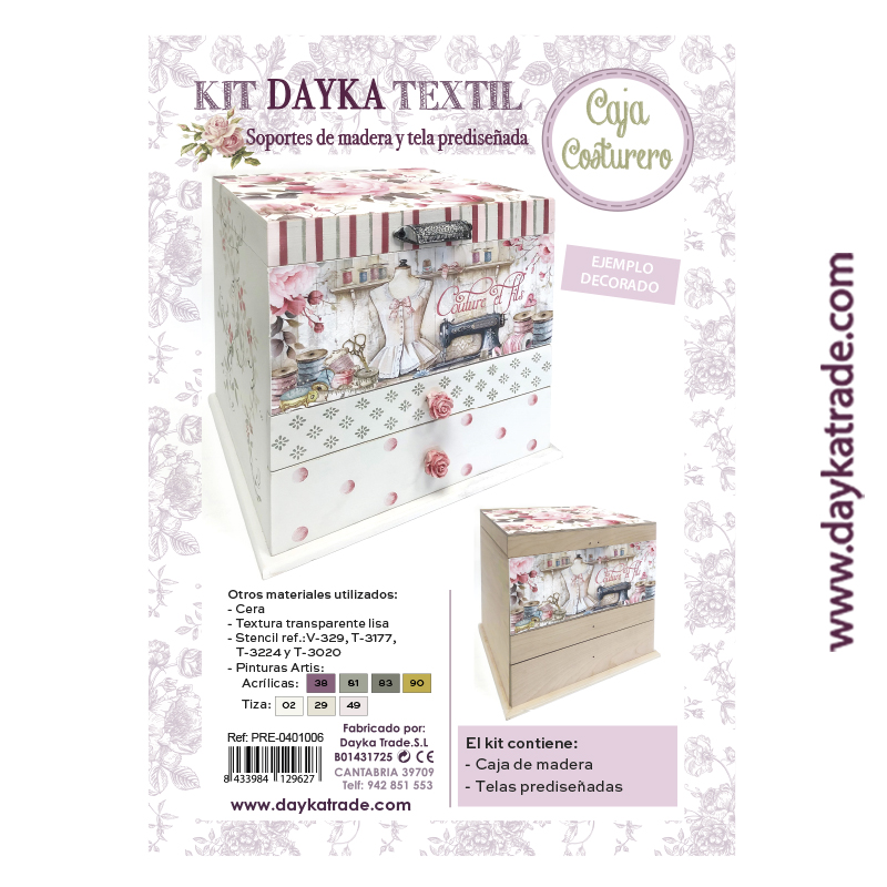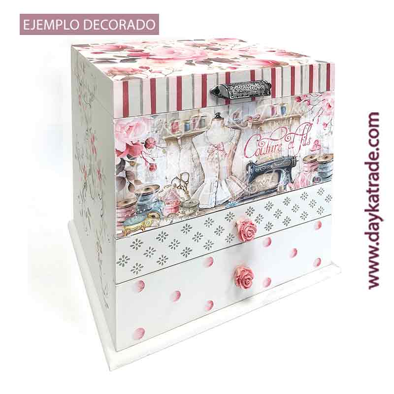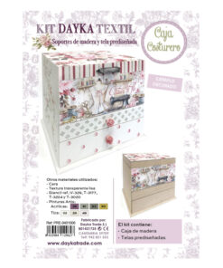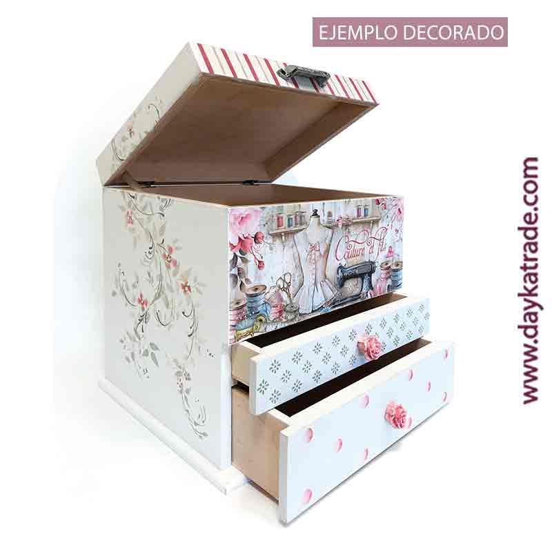 Caja costura de madera dos cajones, tapa y tela. Medidas caja: 32 x 31 x 26 cm. Ideal para pintar con pinturas y productos Artis de Dayka. Tiradores no incluidos en el kit:1393041 y 185.P-55-19