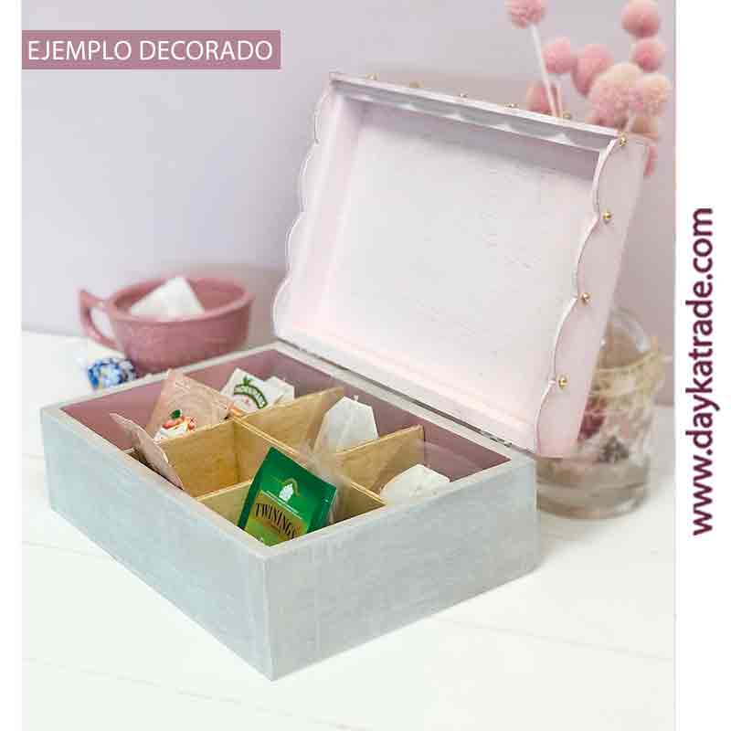 Caja con tela prediseñada perfecta para té o infusiones. Caja de madera con 6 departamentos con tela prediseñada con frase “Infusiona Té”Incluye tela pre-diseñada para la tapa y caja de madera. Medidas: 23 x 8,7 x 15,5 cm