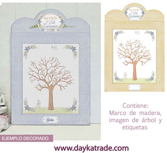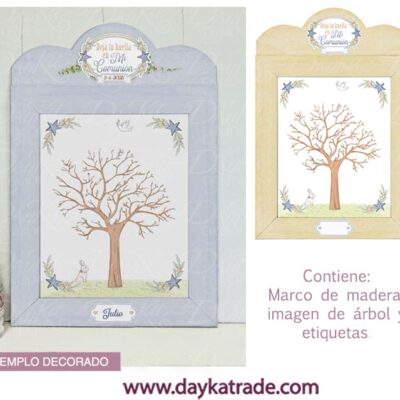Contiene: marco de madera, tela con ilustración de árbol con ramas y estrellas, etiqueta con texto “Deja tu huella en mi comunión” y etiqueta para escribir el nombre y la fecha. Un bonito recuerdo para que tus invitados dejen su huellas en tu comunión colección “Amor y Fe». Tamaño 30×44,5 para pintar con pinturas y productos Artis de Dayka.