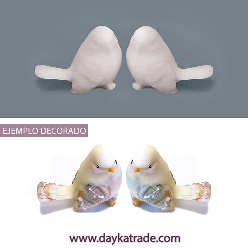 Figuras de dos pájaros para decorar. Figura decorativa de dos pajaritos ideal para pintar y decorar con pinturas ArtisDayka.Tamaño de cada pájaro: 6 x 4 x 5,6 cm. Referencia: RES-004