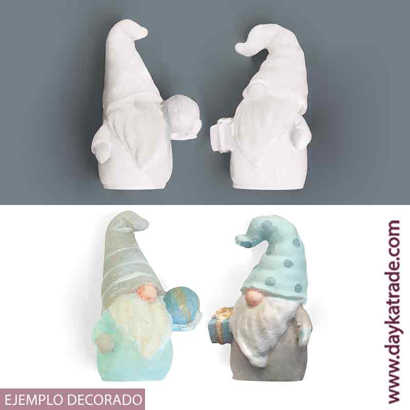 Figuras de dos gnomos. Figura decorativa de dos gnomos ideal para pintar y decorar con pinturas ArtisDayka. Medidas: 3,3 x 5,5 x 2,5 cm. Referencia: RES-009