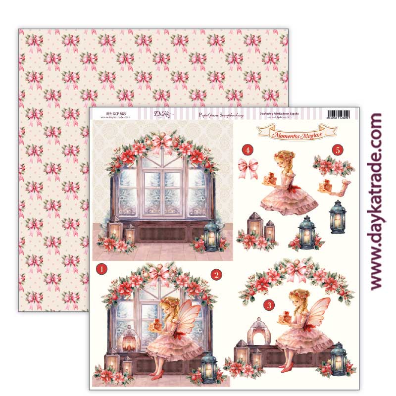 Papel para Scrapbooking Dayka, delantera de escena de hada en ventana para tridimensional y fondo de lazos navideños rosas.