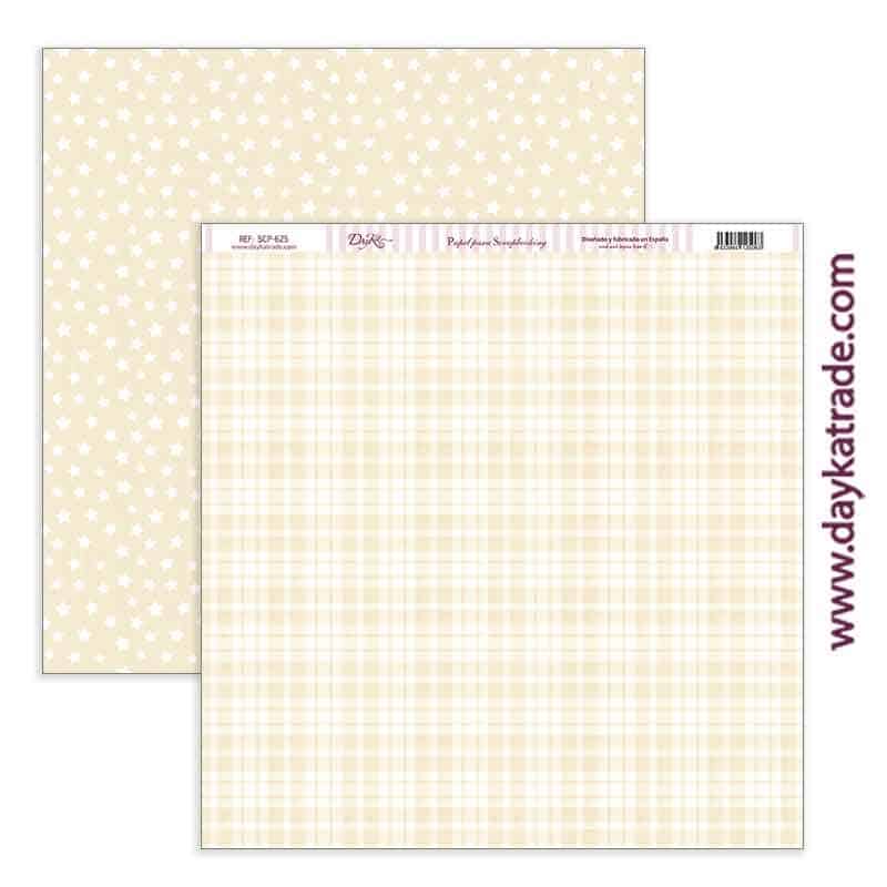 Papel para Scrapbooking Dayka, delantera de cuadros amarillos. Trasera fondo de estrellas amarillas.