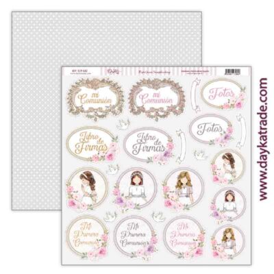 Papel a doble cara Dayka, diseñado y producido en España. Papel 224 gr.Ideal para tus proyectos de scrap comunión.