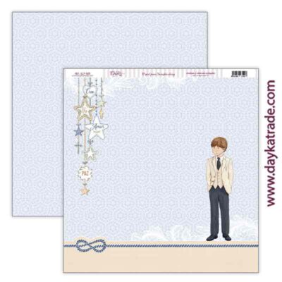 Papel scrap colección Comunión “Amor y fe” Papel para Scrapbooking Dayka, delantera de niño de Comunión con traje y estrellas colgando.