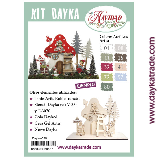 Dayka-536 Contiene la silueta de una seta casa con unos niños, unos pinos y carrito con regalos, de madera. Con cartelito en tablero lacado de Feliz Navidad.