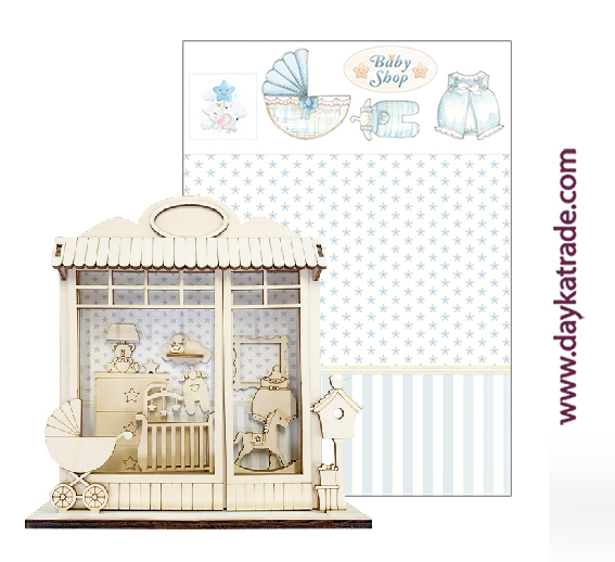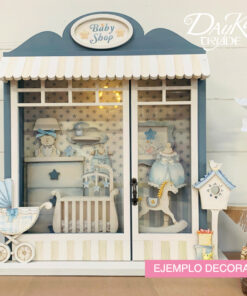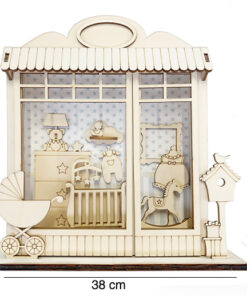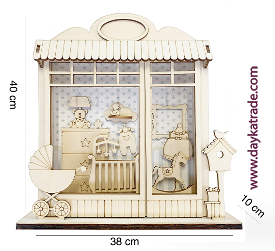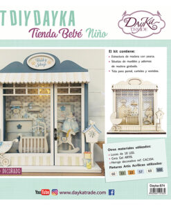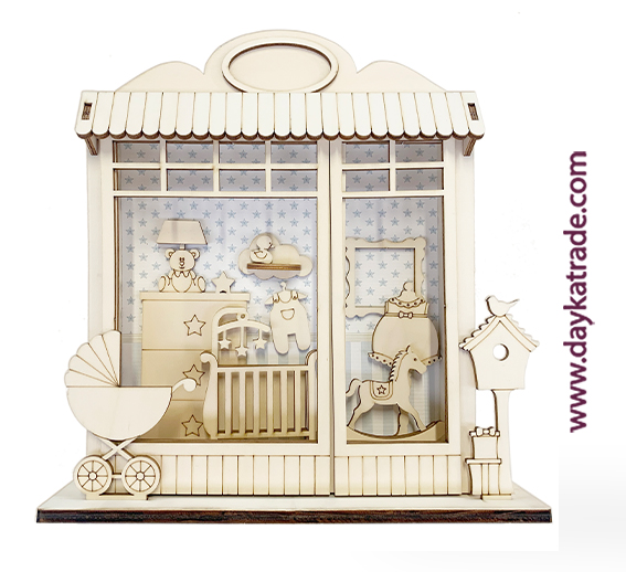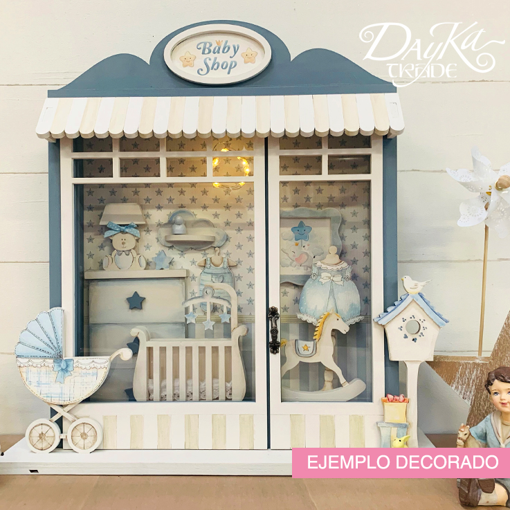 La tienda de bebé contiene estructura y piezas de madera. Cada complemento está realizado con detalle para colocar en su interior: armario, cuna, estanterías, estrellas…